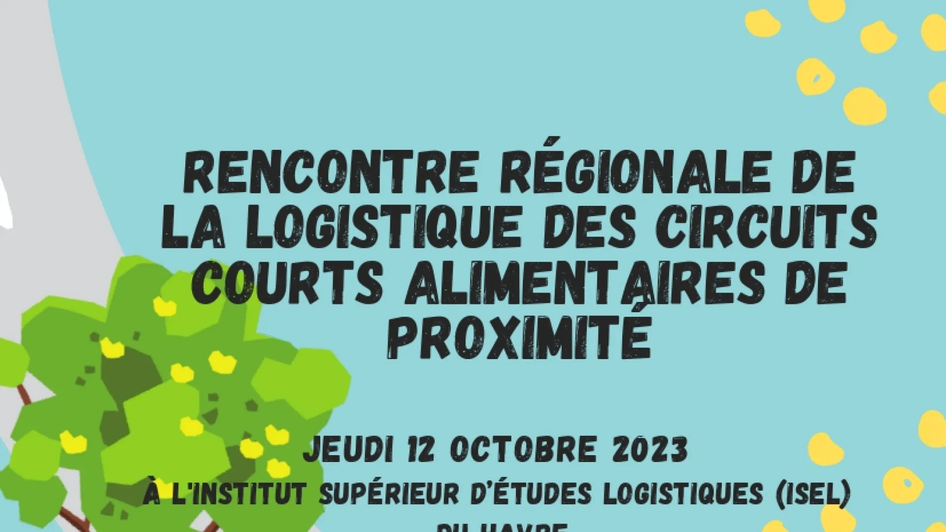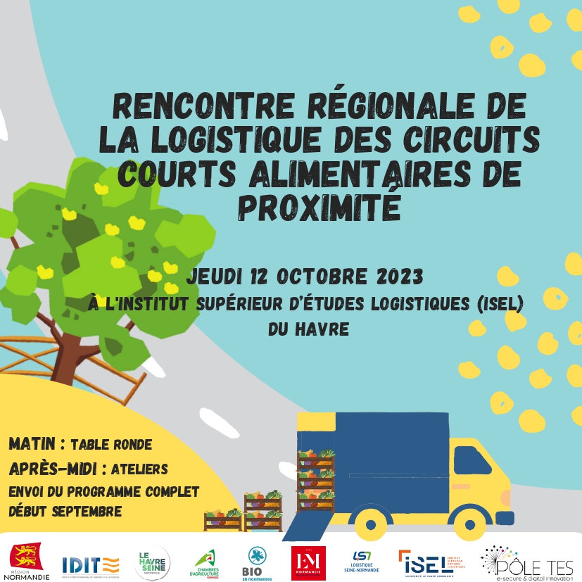 Le jeudi 12 octobre 2023, la Région Normandie, en partenariat avec l’Institut Supérieur d’Études Logistiques, l’École de Management de Normandie, l'Institut du Droit International des Transports, Logistique Seine-Normandie, le Pôle TES, le Havre Seine-Métropole, la Chambre régionale d'agriculture de Normandie et l'association Bio en Normandie, organise la 3ème édition des Rencontres régionales de la logistique des circuits courts alimentaires et de proximité, à l'institut Supérieur d’Études Logistiques (ISEL), au Havre.