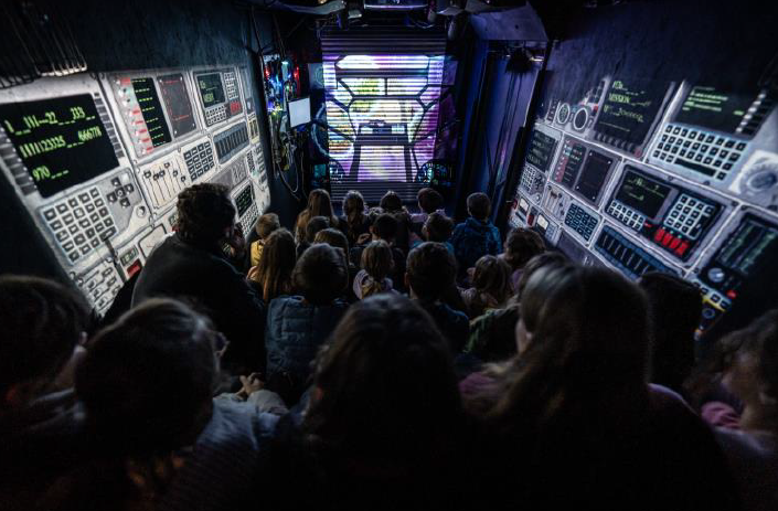 La scène itinérante : 40 personnes peuvent s’installer dans ses gradins, face à la scène et se laisser porter par le spectacle, le son, la lumière, les effets spéciaux et numériques.