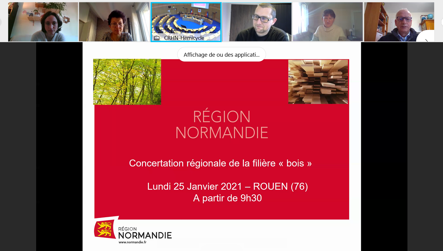 En présence de Mme EUDIER, Vice-Présidente à l’agriculture, à la pêche, à la filière équine et la forêt, une concertation régionale de la filière bois a eu lieu à ROUEN, le 25 Janvier 2020 dans la perspective de la préparation de la nouvelle Politiques Agricole Commune et la nouvelle stratégie régionale forêt-bois. En raison de la crise sanitaire, celle-ci a eu lieu en visio et en présentiel et a réuni une vingtaine de structures à envergure régionale de la filière « bois ».