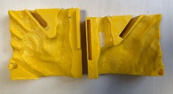 - Sur la deuxième photo, applicateur obtenu par impression 3D, la main apparaissant en négatif